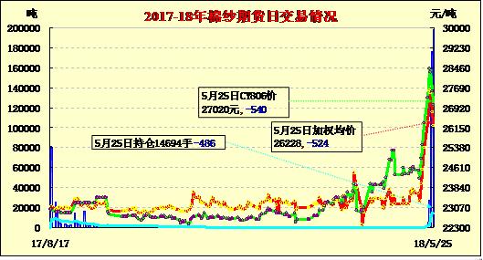 5月25日受期棉平倉回落影響,棉紗期貨減倉大跌。隔夜棉紗期貨低開,今日盤中低位震蕩,尾盤平倉壓制回落,日內(nèi)放量大跌。當(dāng)日各合約加權(quán)平均成交價(jià)26228元/噸,較昨日跌524元,成交19.79萬手,增2.17萬手,總持倉1.47成手,減486手。其中主力CY810合約26225元/噸,跌525元,成交19.6萬手,增2.08萬手,減倉700手,持倉減至1.43萬手。今日鄭棉期貨盤中一度調(diào)整,午后回穩(wěn)盤整,尾盤在平倉盤壓制下回落,日線形成陽線星。日內(nèi)成交量萎縮,持倉量近減遠(yuǎn)增。受近日期棉和棉紗期貨巨幅波動(dòng)影響,企業(yè)報(bào)價(jià)混亂,棉紗報(bào)價(jià)多有跟漲態(tài)勢(shì),據(jù)了解,魏橋近日棉紗報(bào)價(jià)向上普調(diào)千元,大部分企業(yè)普漲200-500元不等。