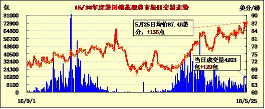 5月25日紐約期棉市場全面收漲,加權(quán)平均成交價87.64美分/磅,漲116點,其中1807合約結(jié)算價89.21美分,漲175點。受此影響,美國七地現(xiàn)貨價格全線上調(diào),標(biāo)準(zhǔn)級成交均價84.94美分/磅,中準(zhǔn)級成交均價87.46美分/磅,較前一交易日張136點,比期棉7月合約低492點。主產(chǎn)棉區(qū)東得克薩斯洲漲25點,標(biāo)準(zhǔn)級報收77.75美分/磅,漲25點,比期棉主力合約價低1146點,其它地區(qū)均上調(diào)175點左右。