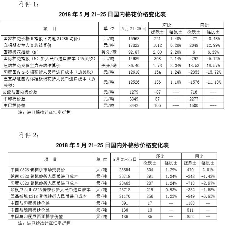 附件1:2018年5月21-25日國內(nèi)外棉花價(jià)格變化表