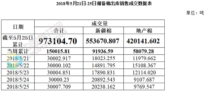 上周(2018年5月21-25日),2017/2018年度儲備棉輪出第十一周,中國儲備棉管理有限公司上市交易儲備棉15萬噸,其中新疆棉9.2萬噸,地產(chǎn)棉5.8萬噸;實際成交15萬噸,成交率100%,新疆棉、地產(chǎn)棉均全部成交。