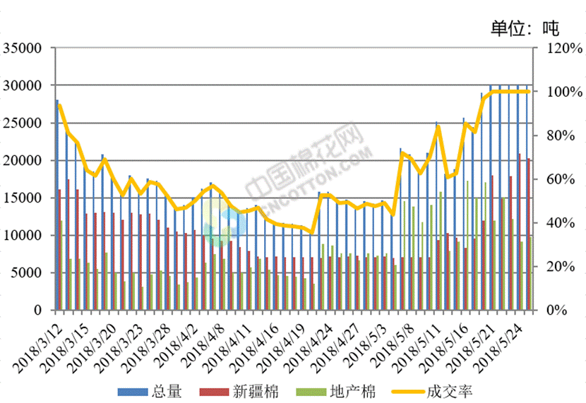 截至2018年5月25日,2017/2018年度儲備棉輪出累計掛牌159萬噸,其中新疆棉55萬噸、地產(chǎn)棉104萬噸;累計成交97萬噸,成交率61%,其中新疆棉成交55萬噸,成交率99.99%,地產(chǎn)棉成交42萬噸,成交率43%;累計成交企業(yè)541家,其中紡織企業(yè)380家,成交46萬噸;貿(mào)易商161家,成交51萬噸。