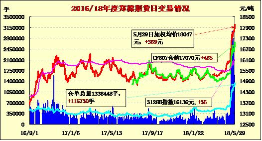 5月29日隔夜鄭棉盤整,今日早盤在多頭買盤推動(dòng)下上漲,終盤收于漲停,日線形成長(zhǎng)陽(yáng)線。日內(nèi)成交量放大,持倉(cāng)量增加?;久媲闆r:現(xiàn)貨市場(chǎng)方面大盤氣氛雖一般為主,棉商心態(tài)有些不一,有觀望,有惜售。但成交量尚可,價(jià)格穩(wěn)中堅(jiān)挺,現(xiàn)內(nèi)地329級(jí)棉花主流價(jià)16050元/噸左右,市場(chǎng)心態(tài)還好,紗廠采購(gòu)量相對(duì)不錯(cuò)。