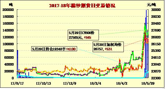 5月29日棉花、棉紗期貨雙雙收于漲停。隔夜棉紗期貨平開整理,受棉花期貨漲停刺激,棉紗期貨放量反彈也收于漲停,平均漲幅530元以上,有的漲千元以上,價格水平回歸至26700元左右。其中主力CY810收于27275元/噸,結(jié)算價26755元/噸,漲530元,增倉4102手,持倉1.88萬手。
