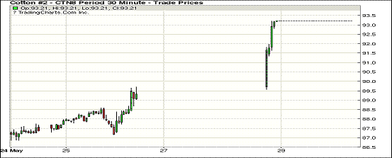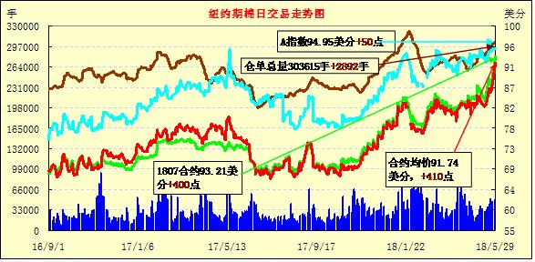 5月29日紐約期棉市場漲停。1807合約結算價93.21美分,漲400點;1812合約結算價90.65美分,漲400點;1903合約結算價90.24美分,漲400點。其他合約上漲194-400點不等。延續(xù)前幾日上漲行情,7月合約開盤后交易重心即刻快速走高,漲停至93.21美分,后維持高位運行態(tài)勢,直至收盤。近4個交易日7月合約累計上漲632點。29日紐約期棉前6個合約均達到漲停,30日漲停幅度將擴大100點至500點。隨著副熱帶風暴Alberto的緩慢移動,給佛羅里達州狹長地帶、阿拉巴馬以及密西西比地區(qū)帶來大量降雨。目前尚無法判斷此次風暴是否會對棉田造成任何影響。外圍美元指數(shù)上漲,玉米、小麥和大豆期貨下跌。
