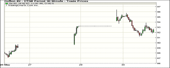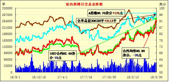 5月30日紐約期棉市場整體小幅回落。1807合約結算價92.49美分,跌72點;1812合約結算價90.85美分,漲20點;1903合約結算價90.18美分,跌6點。當日7月合約開盤后交易重心受支撐上行,至當日高點96.40美分處,受獲利了結盤壓力市場走低,至當日低點91.22美分處買盤入場,交易重心受支撐出現(xiàn)小幅回升,最終以小幅下跌收盤。1812合約延續(xù)漲勢,收高20點,7月/12月合約價差收窄至164點。某大型多頭基金開始7-12月移倉。外圍美元指數(shù)下跌,玉米、小麥和大豆期貨下跌。