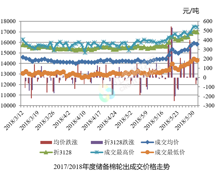 5月31日儲備棉輪出銷售資源30000.5852噸,實(shí)際成交30000.5852噸,成交率100.00%。平均成交價(jià)格15902元/噸(較前一日下跌71元/噸);折3128價(jià)格17056元/噸(較前一日下跌31元/噸)。
