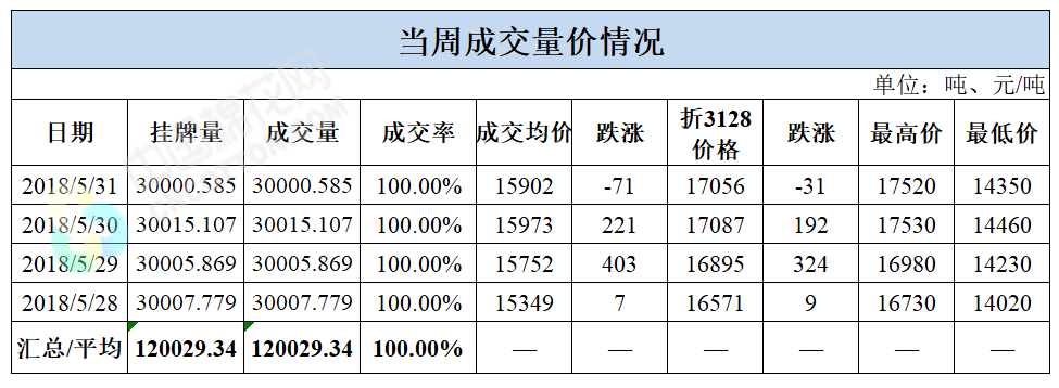 累計(jì)情況:截至5月31日,累計(jì)計(jì)劃出庫171萬噸,累計(jì)出庫成交109.3萬噸,成交率為64%;成交最高價(jià)17530元/噸,最低價(jià)12700元/噸。
