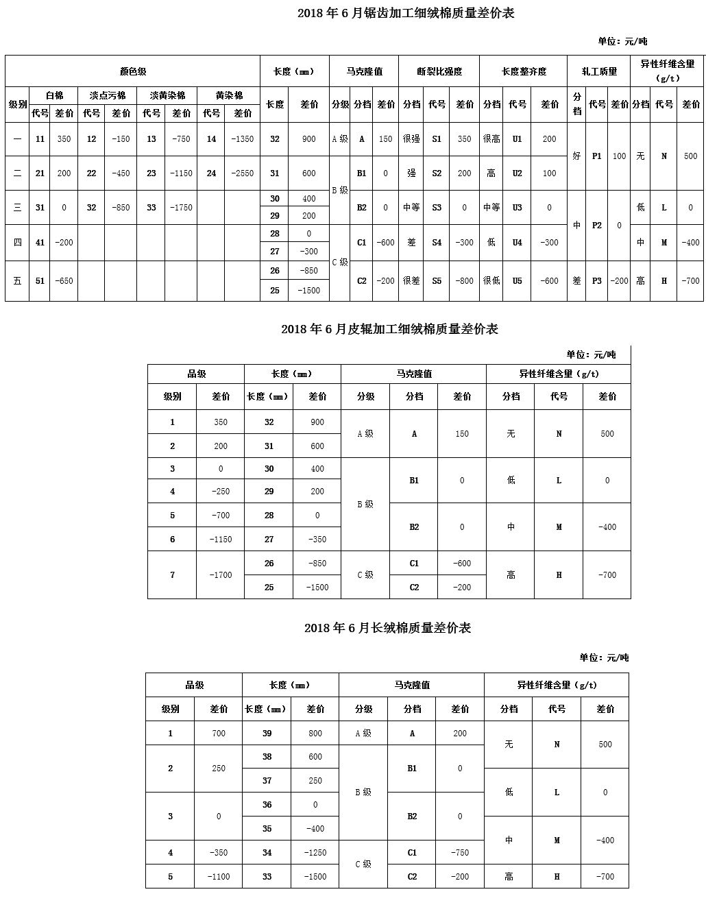 根據(jù)《中國棉花協(xié)會(huì)國產(chǎn)棉質(zhì)量差價(jià)表管理辦法》規(guī)定,現(xiàn)正式發(fā)布2018年6月《鋸齒加工細(xì)絨棉質(zhì)量差價(jià)表》、《皮輥加工細(xì)絨棉質(zhì)量差價(jià)表》和《長絨棉質(zhì)量差價(jià)表》(單位:元/噸)。