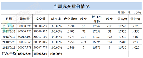 累計(jì)情況:截至6月1日,累計(jì)計(jì)劃出庫(kù)174萬(wàn)噸,累計(jì)出庫(kù)成交112.3萬(wàn)噸,成交率為65%;成交最高價(jià)17530元/噸,最低價(jià)12700元/噸。