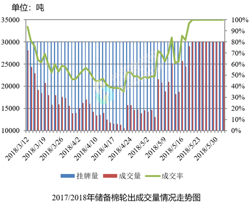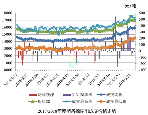 6月1日儲(chǔ)備棉輪出銷(xiāo)售資源30008.6972噸,實(shí)際成交30008.6972噸,成交率100.00%。平均成交價(jià)格15938元/噸(較前一日上漲36元/噸);折3128價(jià)格17044元/噸(較前一日下跌12元/噸)。