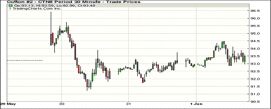 6月第一個(gè)交易日紐約期棉市場全面收漲。1807合約結(jié)算價(jià)93.30美分,漲15點(diǎn);1812合約結(jié)算價(jià)92.36美分,漲72點(diǎn);1903合約結(jié)算價(jià)92.00美分,漲114點(diǎn)。其他合約上漲95-116點(diǎn)不等。當(dāng)日7月合約平穩(wěn)開盤后受買盤支撐交易重心走高,一路向上突破94美分一線至當(dāng)日高點(diǎn)94.49美分,后美棉出口周報(bào)發(fā)布后,裝運(yùn)量不及預(yù)期,市場應(yīng)聲下行,加之賣盤高點(diǎn)入場,跌幅加深,一路向下?lián)舸?3美分一線,低點(diǎn)處買盤發(fā)力,市場受支撐上行,后呈震蕩態(tài)勢運(yùn)行,最終于新高點(diǎn)93.30美分收盤,小幅收漲。據(jù)美國農(nóng)業(yè)部(USDA),5.17-5.24日一周美國凈簽約出口2017/18年度陸地棉3788噸(含新簽約15468噸,另取消11680噸前期訂單),較前一周減少67%,較近4周平均簽約量減少89%;裝運(yùn)2017/18年度陸地棉84663噸,較前一周減少7%,較近4周平均減少16%。凈簽約出口2018/19年度陸地棉54000噸,較前一周增加56.4%。1日為某大型多頭基金7-12月移倉第三天。外圍美元指數(shù)上漲,大豆期貨上漲,玉米和小麥期貨下跌。