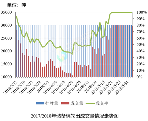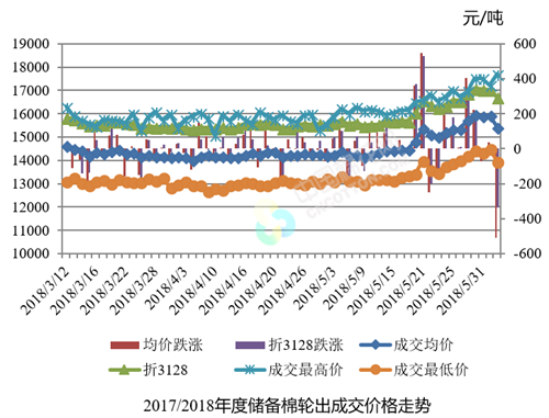 6月4日儲(chǔ)備棉輪出銷售資源30010.4485噸,實(shí)際成交29806.3795噸,成交率99.32%。平均成交價(jià)格15430元/噸(較前一日下跌508元/噸);折3128價(jià)格16707元/噸(較前一日下跌337元/噸)。