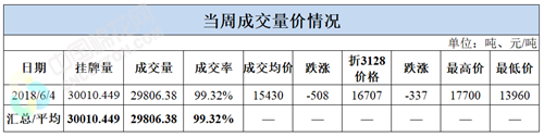 累計(jì)情況:截至6月4日,累計(jì)計(jì)劃出庫(kù)177萬噸,累計(jì)出庫(kù)成交115萬噸,成交率為65%;成交最高價(jià)17700元/噸,最低價(jià)12700元/噸。