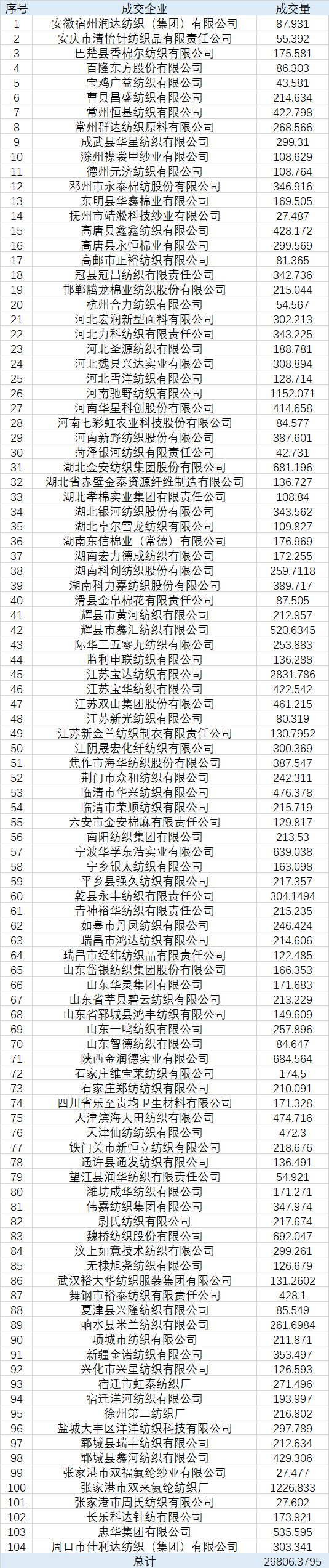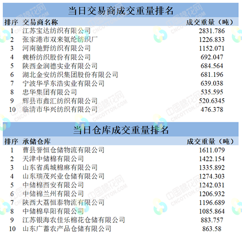 地產(chǎn)棉成交6283.914噸,成交率97%,成交均價(jià)14791元/噸,平均加價(jià)399元/噸,最高成交價(jià)15880元/噸,最低成交價(jià)13960元/噸;新疆棉成交23522.4655噸,成交率100%,成交均價(jià)15601元/噸,平均加價(jià)978元/噸,最高成交價(jià)17700元/噸,最低成交價(jià)14570元/噸。