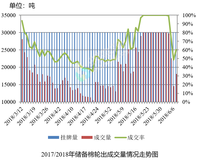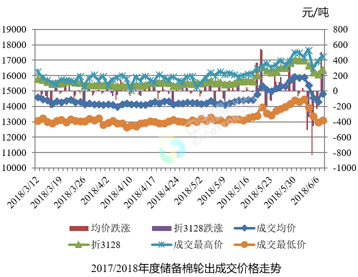 6月7日儲備棉輪出銷售資源30009.8111噸,實際成交18050.3501噸,成交率60.15%。平均成交價格14872元/噸(較前一日上漲505元/噸);折3128價格16446元/噸(較前一日上漲309元/噸)。