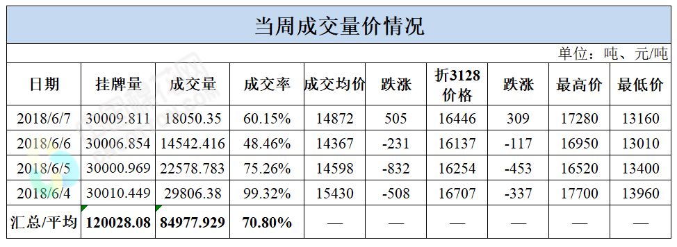 累計情況:截至6月7日,累計計劃出庫186萬噸,累計出庫成交120.8萬噸,成交率為65%;成交最高價17700元/噸,最低價12700元/噸。