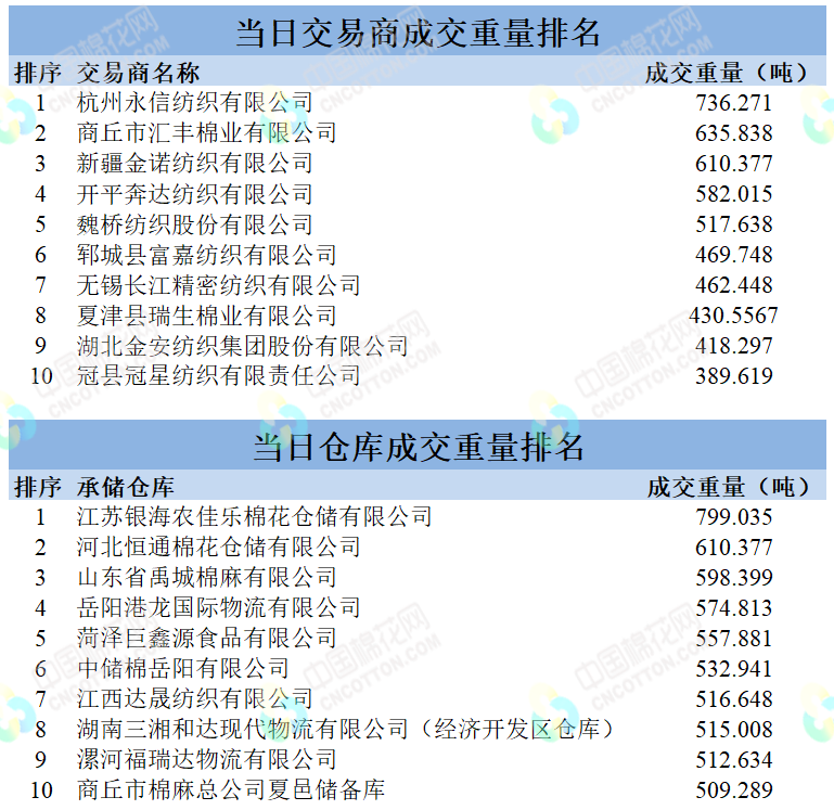 地產(chǎn)棉成交6450.99噸,成交率35%,成交均價14129元/噸,平均加價263元/噸,最高成交價16090元/噸,最低成交價13160元/噸;新疆棉成交11599.4噸,成交率100%,成交均價15285元/噸,平均加價779元/噸,最高成交價17280元/噸,最低成交價13840元/噸。