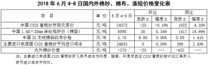 附件2:2018年6月4-8日國內(nèi)外棉紗價(jià)格變化表