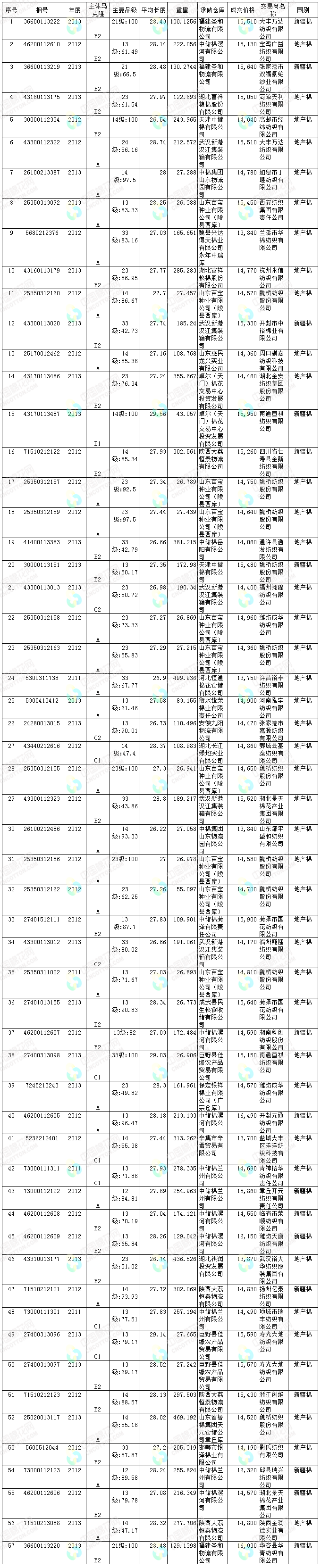 地產(chǎn)棉成交6441.452噸,成交率24.86%,成交均價(jià)14465元/噸,平均加價(jià)215元/噸,最高成交價(jià)15900元/噸,最低成交價(jià)13700元/噸;新疆棉成交3108.8658噸,成交率75.97%,成交均價(jià)15452元/噸,平均加價(jià)626元/噸,最高成交價(jià)16490元/噸,最低成交價(jià)14550元/噸。