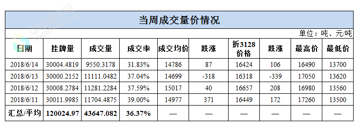 累計(jì)情況:截至6月14日,累計(jì)計(jì)劃出庫(kù)201萬(wàn)噸,累計(jì)出庫(kù)成交126.9萬(wàn)噸,成交率為63%;成交最高價(jià)17700元/噸,最低價(jià)12700元/噸。