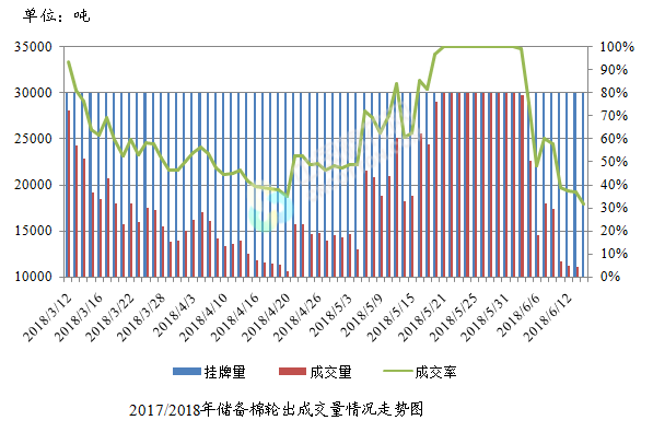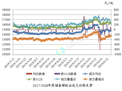 6月14日儲(chǔ)備棉輪出銷(xiāo)售資源30004.4819噸,實(shí)際成交9550.3178噸,成交率31.83%。平均成交價(jià)格14786元/噸(較前一日上漲87元/噸);折3128價(jià)格16424元/噸(較前一日上漲106元/噸)。