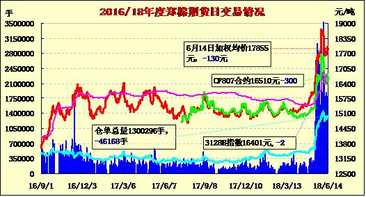 | CF901 | 18040 | 18160 | 17540 | 17570 | 17875 | -140 | 1162624 | -287300 | 33252228 | 763268 | -33846 |