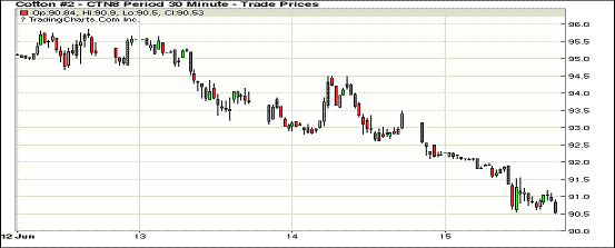 15日紐約期棉主力合約全面收跌。1807合約結(jié)算價90.72美分,跌269點;1812合約結(jié)算價89.85美分,跌311點;1903合約結(jié)算價89.76美分,跌310點。其他合約下跌166-301點不等。當日12月合約小幅低開,開盤后在90.50-91.00美分區(qū)間震蕩運行,后美國政府宣布將對原產(chǎn)于中國的500億美元商品加征25%的關(guān)稅,消息一經(jīng)宣布,期棉價格應(yīng)聲走低,至當日低點89.52美分處買盤發(fā)力,交易重心走高,后小幅回落,圍繞90美分一線震蕩運行,因缺乏有力支撐,最終未站穩(wěn)90美分,以大幅下跌收盤。美國三大股指收跌,玉米、小麥和大豆期貨下跌。