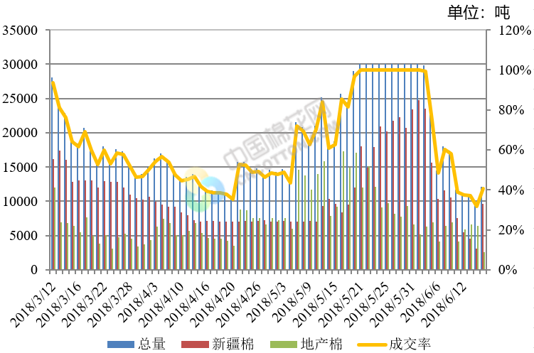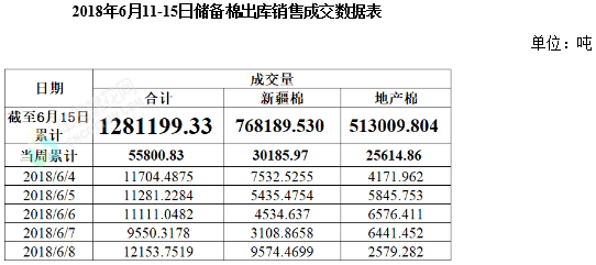 上周(2018年6月11-15日),2017/2018年度儲備棉輪出第十四周,中國儲備棉管理有限公司上市交易儲備棉15萬噸,其中新疆棉3.6萬噸,地產(chǎn)棉11.4萬噸;實際成交5.6萬噸,成交率37%,新疆棉成交3萬噸,成交率85%,地產(chǎn)棉成交2.6萬噸,成交率22%。