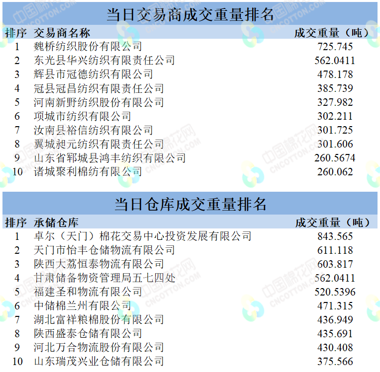 地產(chǎn)棉成交3896.469噸,成交率16.52%,成交均價14604元/噸,平均加價153元/噸,最高成交價16010元/噸,最低成交價13820元/噸;新疆棉成交5510.654噸,成交率85.80%,成交均價15589元/噸,平均加價539元/噸,最高成交價17530元/噸,最低成交價14810元/噸。