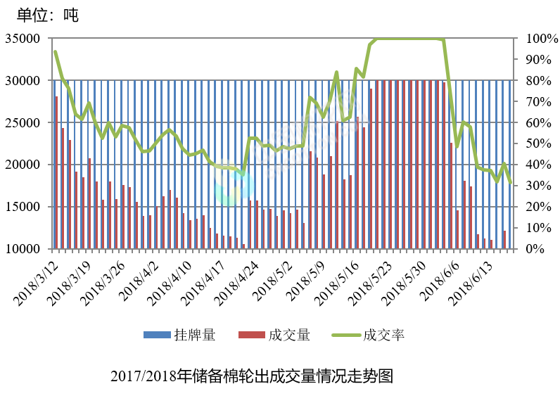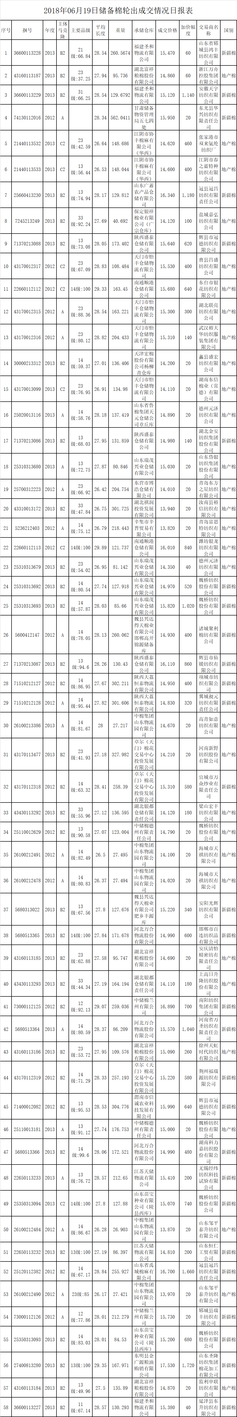 6月19日儲備棉輪出銷售資源30005.3599噸,實際成交9407.1227噸,成交率31.35%。平均成交價格15181元/噸(較前一日下跌4元/噸);折3128價格16392元/噸(較前一日下跌266元/噸)。