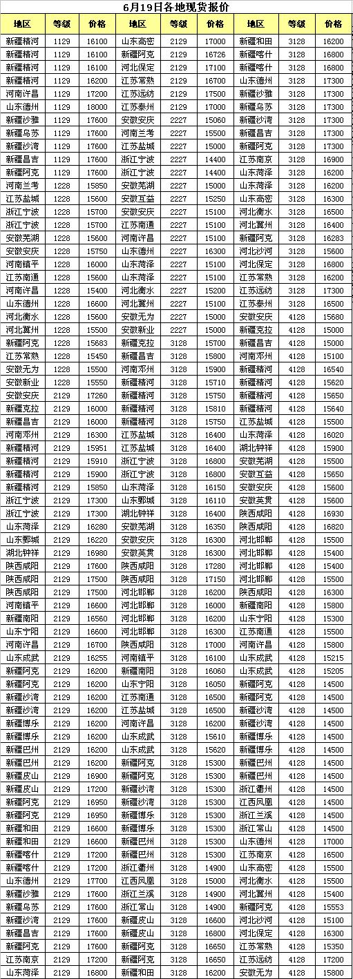| 6月1-6月19日國內(nèi)現(xiàn)貨棉價行情 | ||||||||