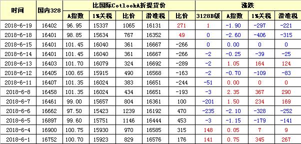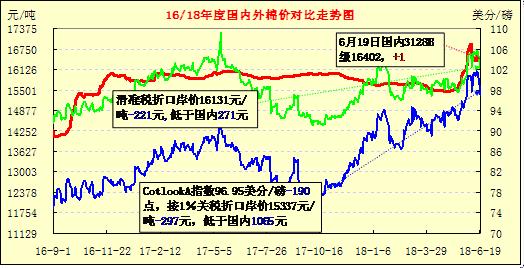 6月20日受中美貿(mào)易戰(zhàn)升溫、鄭棉期貨跌停、紐約期棉持續(xù)下跌等多項(xiàng)疊加因素影響,國際棉價(jià)連續(xù)兩日大幅回調(diào)。20日國際A指數(shù)報(bào)196.95美分/磅,跌190點(diǎn),連續(xù)兩日跌450點(diǎn),跌幅4.4%?;瑴?zhǔn)稅折口岸價(jià)16131元,1%稅率折口岸價(jià)15337元/噸,分別較前一日跌221和297元,兩日累計(jì)分別下跌536元和703元。受外棉大幅收跌,內(nèi)外價(jià)差略有擴(kuò)大,其中1%稅率折口岸價(jià)低于國內(nèi)1065元/噸,滑準(zhǔn)稅折口岸價(jià)低于國內(nèi)221元/噸。