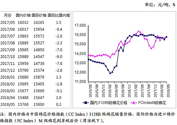 (八)后期走勢(shì)。預(yù)計(jì)短期國內(nèi)棉價(jià)將震蕩上行,國際棉價(jià)有望繼續(xù)上漲。本月,鄭棉期貨主力合約(CF901)日均結(jié)算價(jià)從15日每噸16460元上漲到31日每噸18805元,漲幅14.2%。從供需基本面看,儲(chǔ)備棉投放充足,新棉上市前市場(chǎng)可供資源充足。紡織企業(yè)棉紗產(chǎn)銷率104.3%,服裝出口較上年度持平略漲,企業(yè)棉花原料庫存為1個(gè)月左右,消費(fèi)需求平穩(wěn)。期貨價(jià)格的大幅上漲主要是市場(chǎng)炒作天氣題材,5月新疆連續(xù)發(fā)生大風(fēng)、降溫和沙塵天氣,美國德州核心棉區(qū)干旱,引發(fā)市場(chǎng)恐慌。從后期走勢(shì)看,IMF預(yù)計(jì)2018年全球經(jīng)濟(jì)增長率為3.9%,為2012年以來的最高水平。經(jīng)濟(jì)增長帶動(dòng)紡織服裝需求增加,棉花消費(fèi)量穩(wěn)步增長。ICAC將2018/19全球棉花消費(fèi)量調(diào)增122萬噸至2671萬噸,全球期末庫存調(diào)減103萬噸至1828萬噸,為近5年最低水平。印度、美國和中國等主產(chǎn)國棉花產(chǎn)量下降,全球棉花預(yù)估2568萬噸。