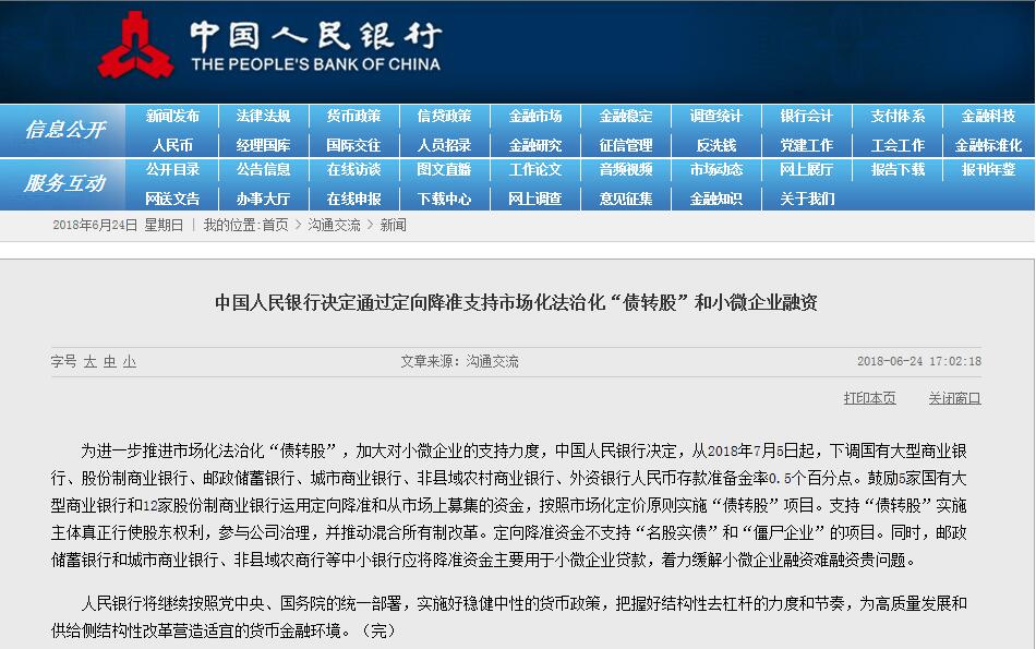 為進一步推進市場化法治化“債轉股”,加大對小微企業(yè)的支持力度,中國人民銀行決定,從2018年7月5日起,下調國有大型商業(yè)銀行、股份制商業(yè)銀行、郵政儲蓄銀行、城市商業(yè)銀行、非縣域農村商業(yè)銀行、外資銀行人民幣存款準備金率0.5個百分點。鼓勵5家國有大型商業(yè)銀行和12家股份制商業(yè)銀行運用定向降準和從市場上募集的資金,按照市場化定價原則實施“債轉股”項目。支持“債轉股”實施主體真正行使股東權利,參與公司治理,并推動混合所有制改革。定向降準資金不支持“名股實債”和“僵尸企業(yè)”的項目。同時,郵政儲蓄銀行和城市商業(yè)銀行、非縣域農商行等中小銀行應將降準資金主要用于小微企業(yè)貸款,著力緩解小微企業(yè)融資難融資貴問題。