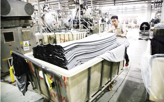 近日,在位于濱海工業(yè)區(qū)的浙江創(chuàng)宇印染有限公司里看到,一匹匹NR面料染色后不斷地運送出來,近20臺氣流染色機馬力全開。相對于傳統(tǒng)的染色,氣流染色機使織物減少染液或者水介質(zhì)的使用,從而大大減少染料、化學(xué)助劑的使用,排放的廢水是傳統(tǒng)染色機的一半,達到綠色環(huán)保印染。(標題:氣流染色機 綠色環(huán)保印染)