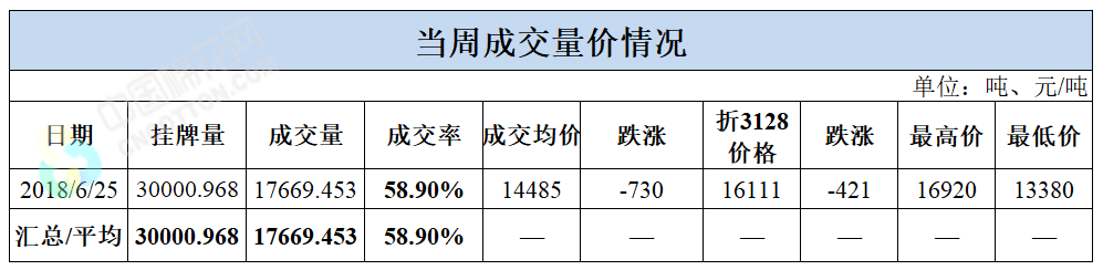 累計(jì)情況:截至6月25日,累計(jì)計(jì)劃出庫(kù)219萬(wàn)噸,累計(jì)出庫(kù)成交133.6萬(wàn)噸,成交率為61%;成交最高價(jià)17700元/噸,最低價(jià)12700元/噸。