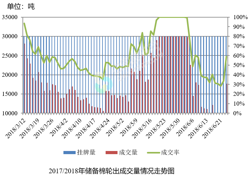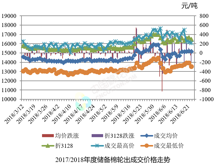 6月25日儲(chǔ)備棉輪出銷售資源30000.9684噸,實(shí)際成交17669.4532噸,成交率58.90%。平均成交價(jià)格14485元/噸(較前一日下跌730元/噸);折3128價(jià)格16111元/噸(較前一日下跌421元/噸)。