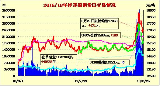 6月25日隔夜鄭棉回升,今日盤中在平倉盤和空頭賣盤壓制下回落,尾盤在短線回補(bǔ)盤支撐下反彈,日線形成陽線星。日內(nèi)成交量放大,持倉量增加?;久媲闆r:美國產(chǎn)棉區(qū)得益于大范圍強(qiáng)降雨天氣,以及亞熱帶風(fēng)暴Alberto帶來的降雨,東南部地區(qū)的干旱區(qū)域基本消除,目前未見明顯旱情。截至5月29日,除伊利諾伊西部小部區(qū)域之外,密西西比河流域東部區(qū)域旱情已完全消除。海灣區(qū)域由于頻繁的對(duì)流天氣使得大面積區(qū)域旱情有所改善,其他包括科羅拉多東北部、堪薩斯以及高地平原區(qū)南部旱情均得益于降雨天氣而有所緩解。