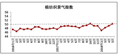 2018年5月中國棉紡織景氣指數(shù)50.21,與4月相比上升0.98,符合預(yù)期。5月棉花期現(xiàn)貨價格快速上漲,紗布產(chǎn)品價格跟漲,儲備棉成交率高企。在原有訂單的支撐下,企業(yè)正常生產(chǎn),紗線銷售較火爆,坯布市場相對清淡。6月為穩(wěn)定國內(nèi)棉花市場,有關(guān)部門相繼發(fā)布相關(guān)政策,之后棉花價格開始回落。但由于市場走淡,企業(yè)接單有所下降,產(chǎn)品庫存開始增加,預(yù)計(jì)6月棉紡織景氣指數(shù)穩(wěn)中略降。