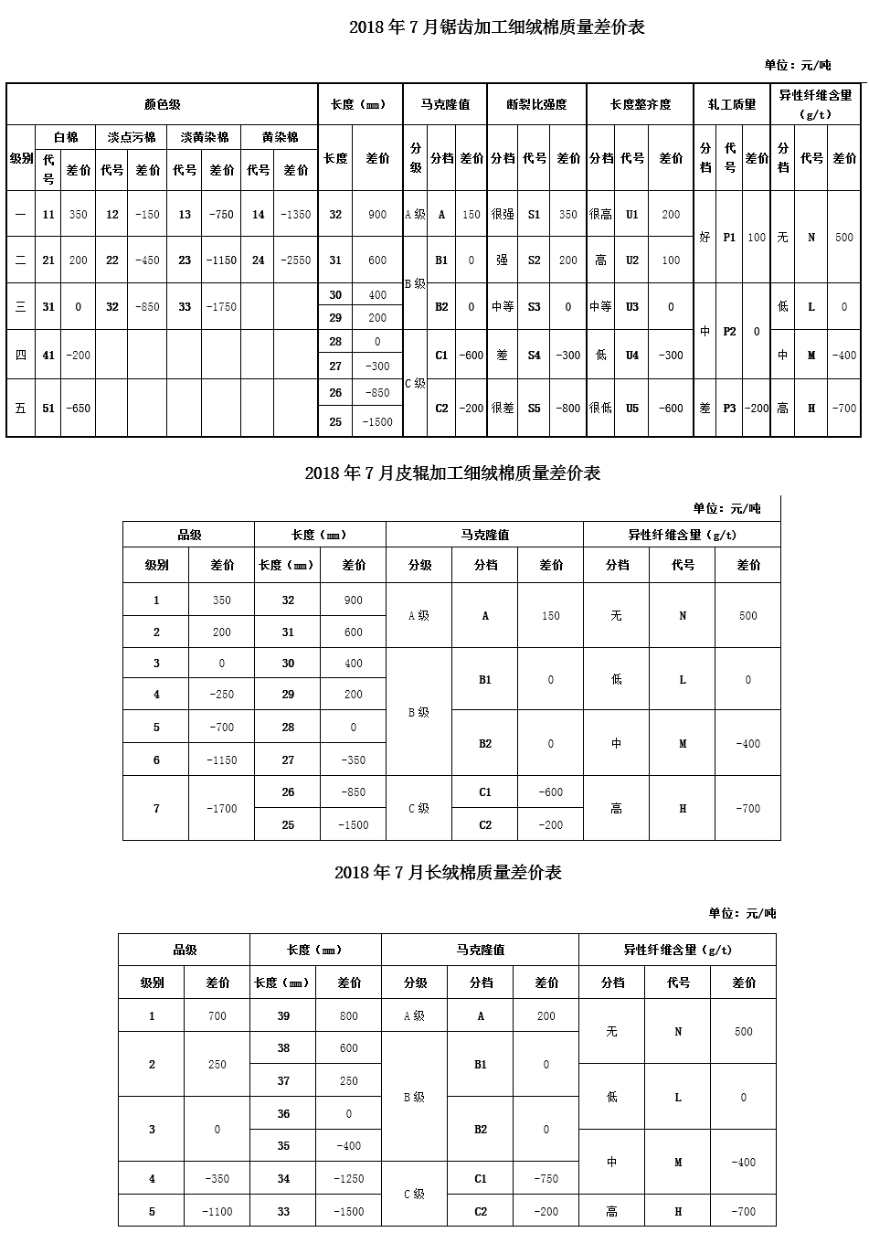 根據(jù)《中國棉花協(xié)會(huì)國產(chǎn)棉質(zhì)量差價(jià)表管理辦法》規(guī)定,現(xiàn)正式發(fā)布2018年7月《鋸齒加工細(xì)絨棉質(zhì)量差價(jià)表》、《皮輥加工細(xì)絨棉質(zhì)量差價(jià)表》和《長絨棉質(zhì)量差價(jià)表》(單位:元/噸)。