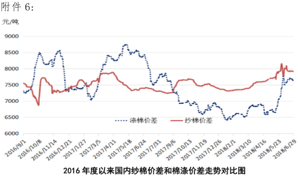 國(guó)內(nèi)棉價(jià)進(jìn)入振蕩調(diào)整行情,突發(fā)行情仍有可能。2018年6月份,中國(guó)制造業(yè)采購(gòu)經(jīng)理指數(shù)(PMI)為51.5%,比上月回落0.4個(gè)百分點(diǎn),新出口訂單指數(shù)為49.8%,比上月下降1.4個(gè)百分點(diǎn),進(jìn)口指數(shù)為50.0%,低于上月0.9個(gè)百分點(diǎn),進(jìn)出口景氣度有所回落。7月1日起,我國(guó)下調(diào)部分亞太國(guó)家的棉花、棉紗、紡織品服裝進(jìn)口關(guān)稅,有利于滿足國(guó)內(nèi)市場(chǎng)需求,同時(shí)外來(lái)商品流入將增加國(guó)內(nèi)紡織企業(yè)競(jìng)爭(zhēng)壓力。7月6日起,美棉將拒之國(guó)門外,增加國(guó)內(nèi)對(duì)剩余澳棉、巴西棉等高等級(jí)棉花的需求,推高進(jìn)口棉價(jià)格,但后道市場(chǎng)需求轉(zhuǎn)弱難以支撐棉價(jià)大漲,加上近期人民幣大幅貶值,進(jìn)口棉、進(jìn)口紗成本增加,國(guó)內(nèi)進(jìn)口需求有可能打折扣,國(guó)內(nèi)棉花資源將會(huì)得到釋放,本周儲(chǔ)備棉成交率重回50%以上,部分機(jī)構(gòu)開(kāi)始籌備新年度新棉購(gòu)銷計(jì)劃。7月份,我國(guó)棉花生長(zhǎng)將進(jìn)入花鈴期,是棉花產(chǎn)量形成關(guān)鍵時(shí)期,天氣狀況是后期關(guān)注重點(diǎn),隨著中美貿(mào)易擔(dān)憂的降溫,國(guó)內(nèi)棉價(jià)或?qū)⑦M(jìn)入調(diào)整階段,不排除貿(mào)易形勢(shì)、政策面乃至天氣狀況變化引發(fā)突發(fā)行情。