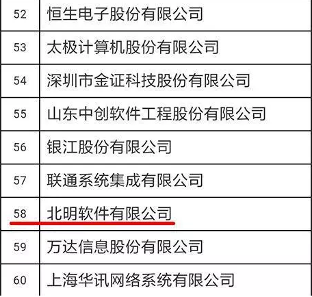 6月29日,由工業(yè)和信息化部指導,中國電子信息行業(yè)聯(lián)合會主辦的“2018中國軟件和信息技術服務綜合競爭力百強企業(yè)發(fā)布會”在第二十二屆中國國際軟件博覽會期間舉行。2018中國軟件百強企業(yè)名單新鮮出爐,石家莊常山北明科技股份有限公司全資子公司北明軟件入圍60強。