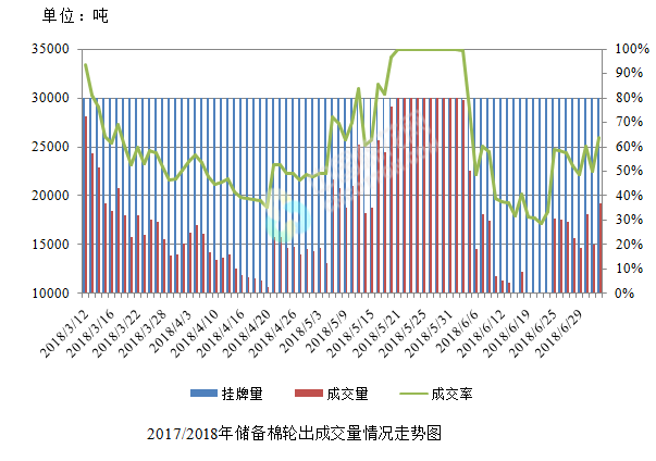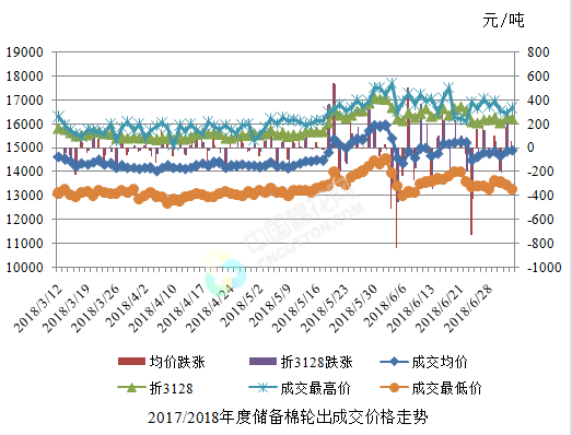7月4日儲(chǔ)備棉輪出銷售資源30002.8378噸,實(shí)際成交19155.8708噸,成交率63.85%。平均成交價(jià)格14924元/噸(較前一日上漲59元/噸);折3128價(jià)格16240元/噸(較前一日下跌21元/噸)。