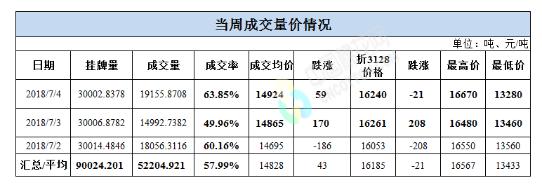 累計(jì)情況:截至7月4日,累計(jì)計(jì)劃出庫(kù)240萬噸,累計(jì)出庫(kù)成交145.1萬噸,成交率為60.5%;成交最高價(jià)17700元/噸,最低價(jià)12700元/噸。