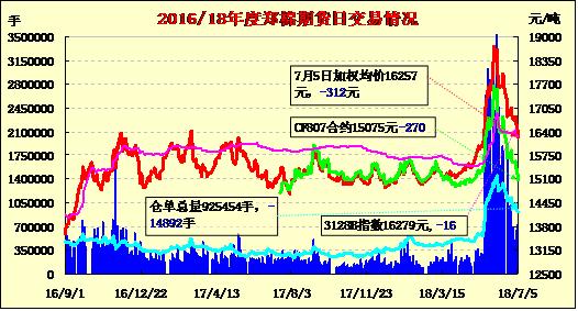 7月5日隔夜鄭棉下滑,今早盤慣性下探后在多頭買盤推動(dòng)下回升,此后橫向震蕩,日線形1/2下影線的陰線。日內(nèi)成交量放大,持倉量減少?;久媲闆r:據(jù)印度當(dāng)?shù)孛襟w消息,印度政府計(jì)劃提高2018/19年度籽棉最低收購價(jià)(MSP)。其中中等長度籽棉最低收購價(jià)可能由4020上調(diào)至5150盧比/公擔(dān);較長長度籽棉最低收購價(jià)可能由4320上調(diào)至5450盧比/公擔(dān)。
