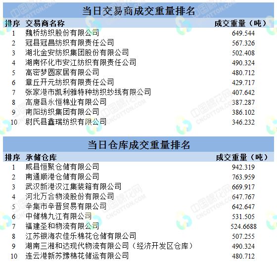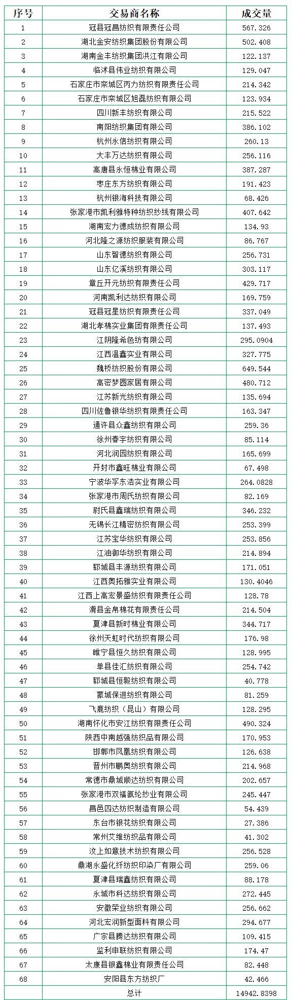 地產棉成交6311.667噸,成交率32.72%,成交均價14244元/噸,平均加價431元/噸,最高成交價15710元/噸,最低成交價13500元/噸。新疆棉成交8631.1728噸,成交率80.55%,成交均價15001元/噸,平均加價927元/噸,最高成交價16590元/噸,最低成交價14110元/噸。