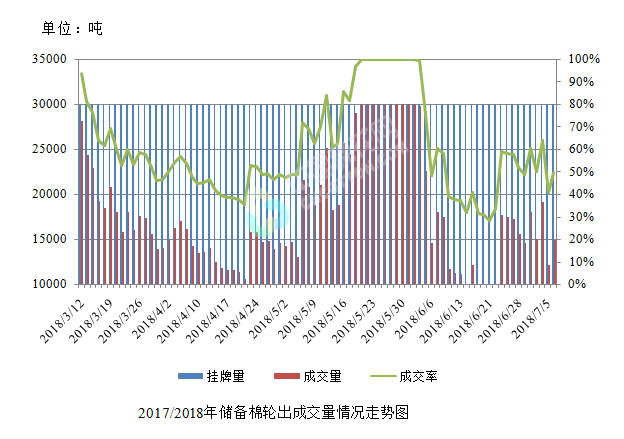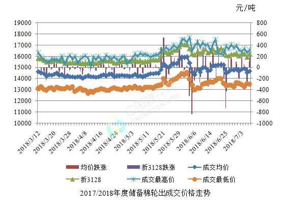 7月6日儲備棉輪出銷售資源30008.2438噸,實際成交14942.8398噸,成交率49.8%。平均成交價格14681元/噸(較前一日上漲117元/噸);折3128價格16224元/噸(較前一日上漲279元/噸)。