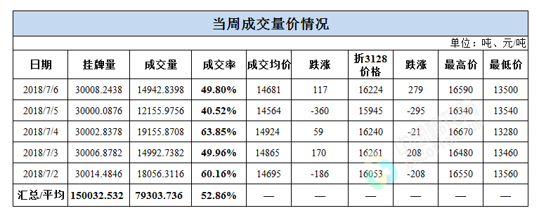累計情況:截至7月6日,累計計劃出庫246萬噸,累計出庫成交147.8萬噸,成交率為60.08%;成交最高價17700元/噸,最低價12700元/噸。