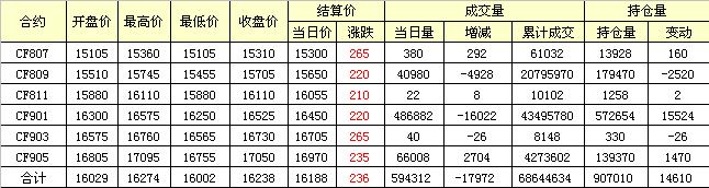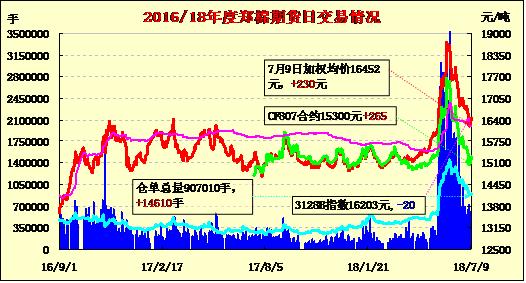 7月9日上周五紐約棉花期貨上漲,隔夜鄭棉上漲,今日早盤平盤震蕩,日線形成陽線,日內(nèi)成交量變化不大,持倉量增加。基本面情況:預(yù)計(jì)2018年棉花適宜打頂期全疆大部棉區(qū)接近常年。石河子以西的北疆大部棉區(qū)在7月8日前后打頂為宜;巴州北部棉區(qū)、哈密棉區(qū)在7月18日前后,昌吉州棉區(qū)及南疆其余大部棉區(qū)在7月15日前后打頂為宜。機(jī)采棉以及旺長、密度大的棉田打頂期應(yīng)適當(dāng)提前,弱苗田和前期受災(zāi)較嚴(yán)重棉田可適當(dāng)推遲打頂。