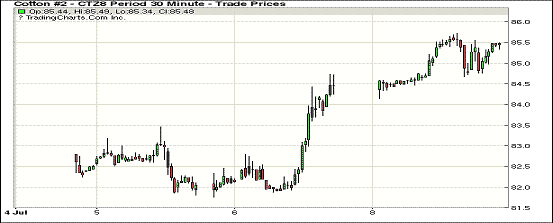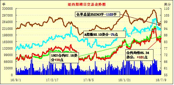7月9日紐約期棉市場(chǎng)漲勢(shì)延續(xù)。1812合約結(jié)算價(jià)85.47美分,漲102點(diǎn);1903合約結(jié)算價(jià)85.36美分,漲108點(diǎn);1905合約結(jié)算價(jià)85.48美分,漲99點(diǎn)。其他合約上漲85-100點(diǎn)不等。當(dāng)日12月合約小幅低開,開盤后交易重心受支撐上行突破85美分一線,至當(dāng)日高點(diǎn)85.72美分處賣盤入場(chǎng),市場(chǎng)承壓走低,后買盤發(fā)力,交易重心受支撐上行,至收盤處維持震蕩運(yùn)行態(tài)勢(shì),最終站穩(wěn)85美分,以漲勢(shì)收盤。外圍美元指數(shù)上漲,大豆、玉米和小麥期貨下跌。美股大幅收高,連漲三日。